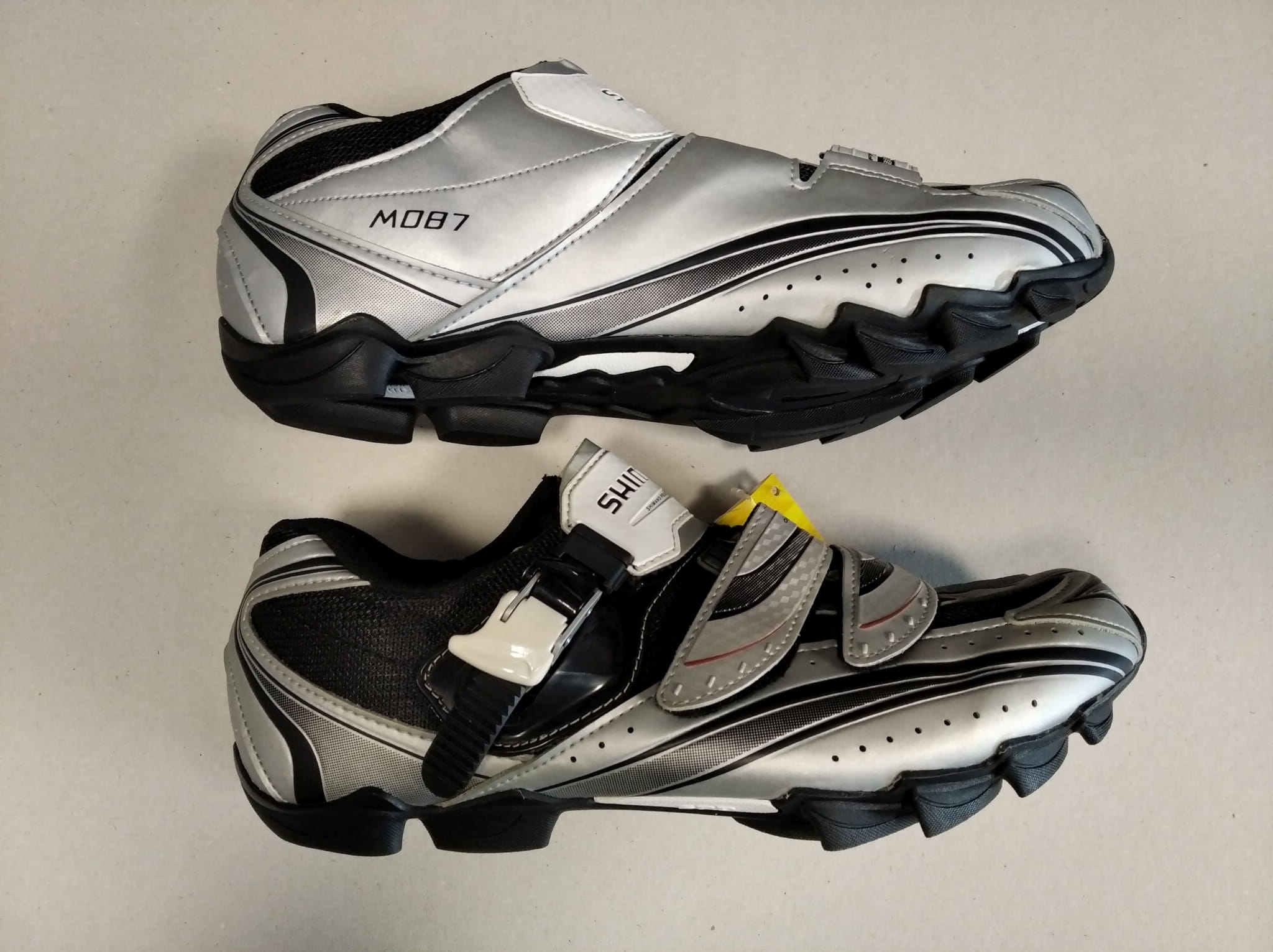 Buty rowerowe Shimano SPD SH-M087 to model przeznaczony do półprofesjonalnej jazdy po trasach górskich. Profilowana gumowa podeszwa ze środkową poliamidową częścią, dodatkowo wzmocnioną włóknem szklanym, zapewnia dobrą stabilność i przełożenie energii na pedały. Wstawki z siateczki poprawiają wentylację buta, a system przesuniętych względem siebie pasków i regulowana sprzączka gwarantują rewelacyjne dopasowanie do stopy kolarza.