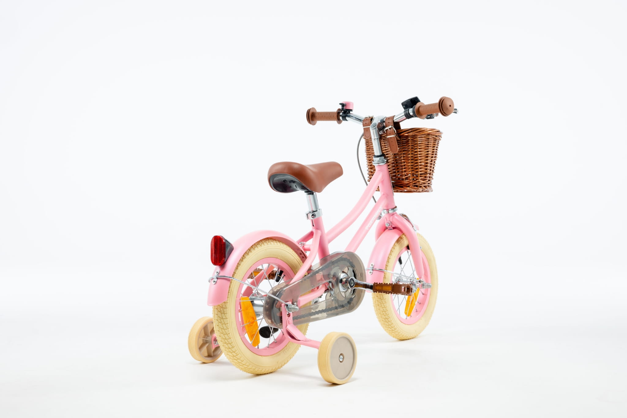 Ten stylowy rowerek został wyposażony w szerokie i stabilne kółka podporowe, błotniki i wiklinowy koszyk.