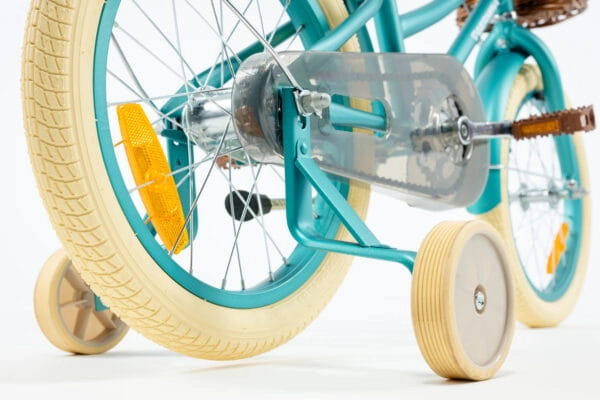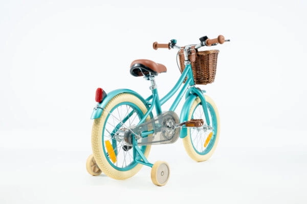 Ten stylowy rowerek został wyposażony w szerokie i stabilne kółka podporowe, błotniki i wiklinowy koszyk.