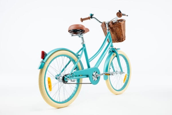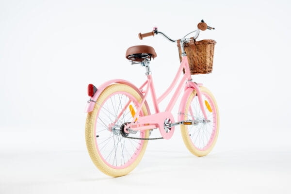 Ten stylowy rowerek został wyposażony w szerokie i stabilne kółka podporowe, błotniki i wiklinowy koszyk.