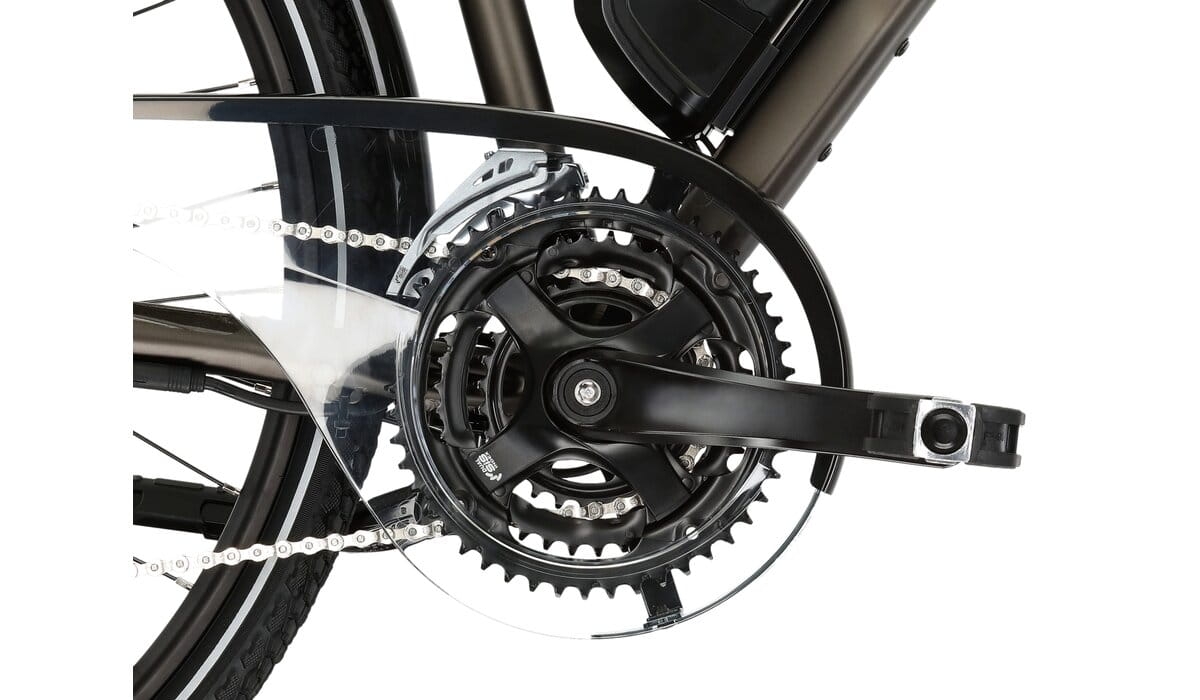 Uzupełnieniem napędu elektrycznego jest ten klasyczny, oparty na trzyrzędowej korbie oraz tylnej przerzutce Shimano Deore obsługującej 8 przełożeń. Takie połączenie umożliwiło uzyskanie 24 biegów umożliwiających dobranie idealnego połączenia, dostosowanego do terenu, w którym aktualnie się znajdziesz. Za bezpieczne hamowanie odpowiadają klasyczne hamulce typu v-brake. Takie rozwiązanie pozwoli Ci na ich łatwy serwis niezależnie od miejsca, w jakim się aktualnie znajdujesz. 28 calowe koła ułatwią Ci pokonywanie miejskich krawężników oraz korzeni, a opony Mitas Flash V66 o szerokości 47 milimetrów zapewnią doskonałe właściwości jezdne w każdych warunkach w tym i na mokrej nawierzchni.