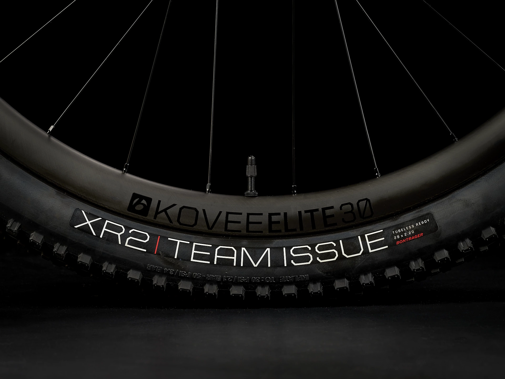 | Koło tylne | Bontrager Kovee Elite 30, włókno węglowe OCLV Mountain, przystosowane do zastosowania bezdętkowego Tubeless Ready, Rapid Drive 54, Microspline, na 6 śrub, Boost148, oś przelotowa 12 mm |