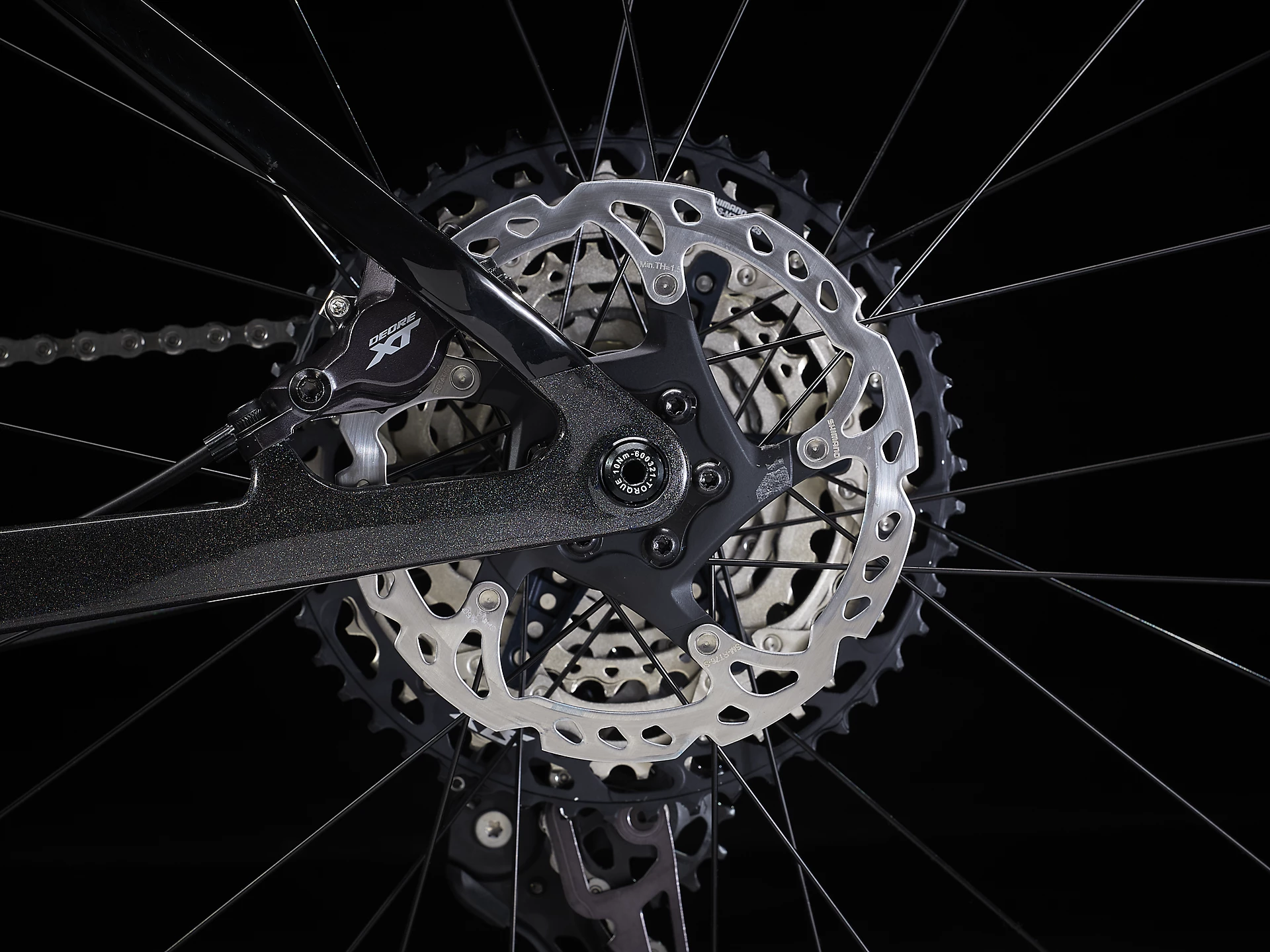 | Piasta tylna | Rozmiar: S , M , ML , L , XL , XXL Bontrager ze stopu aluminium, z uszczelnianymi łożyskami maszynowymi, oś ze stopu aluminium, tarcza na 6 śrub, bębenek Shimano MicroSpline, Boost148, oś przelotowa 12 mm |
